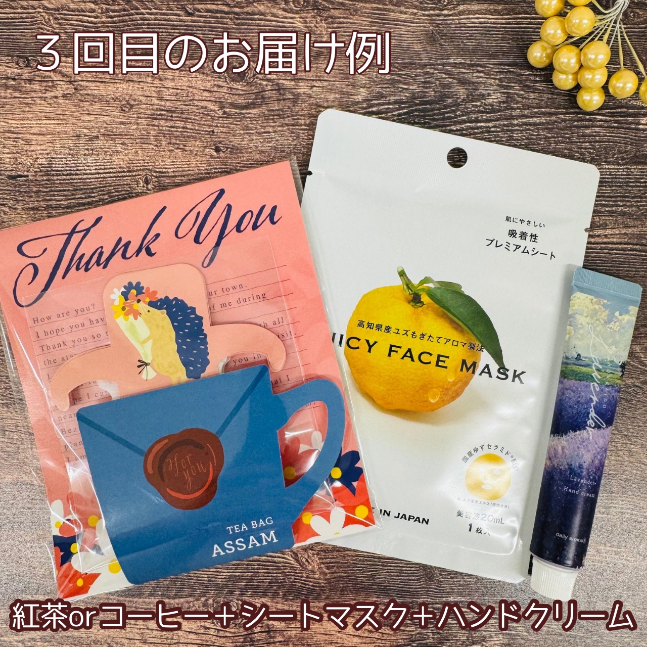 ・3回目:プチギフト3点セット(例:ハンドクリーム+紅茶+シートマスク)